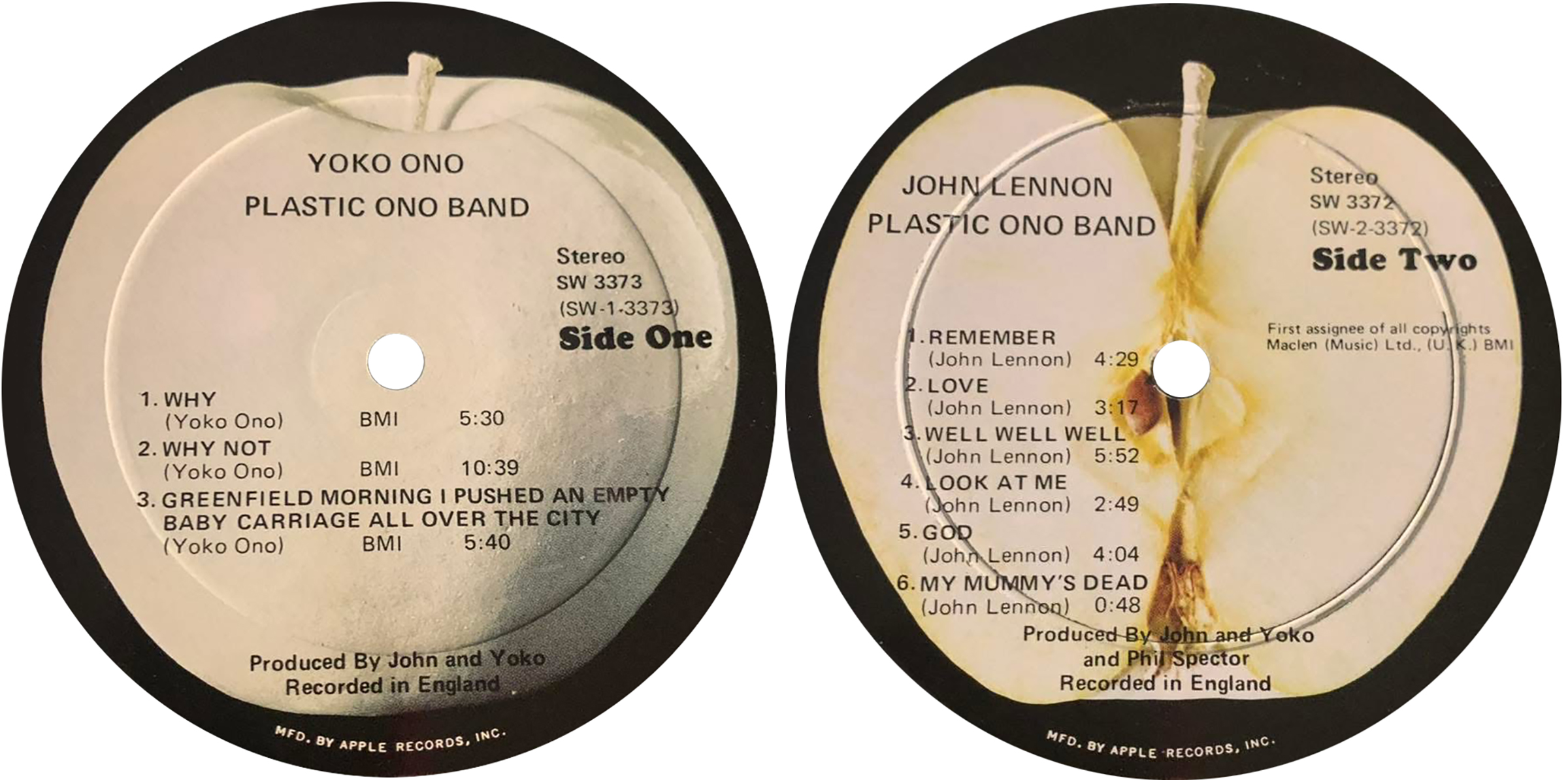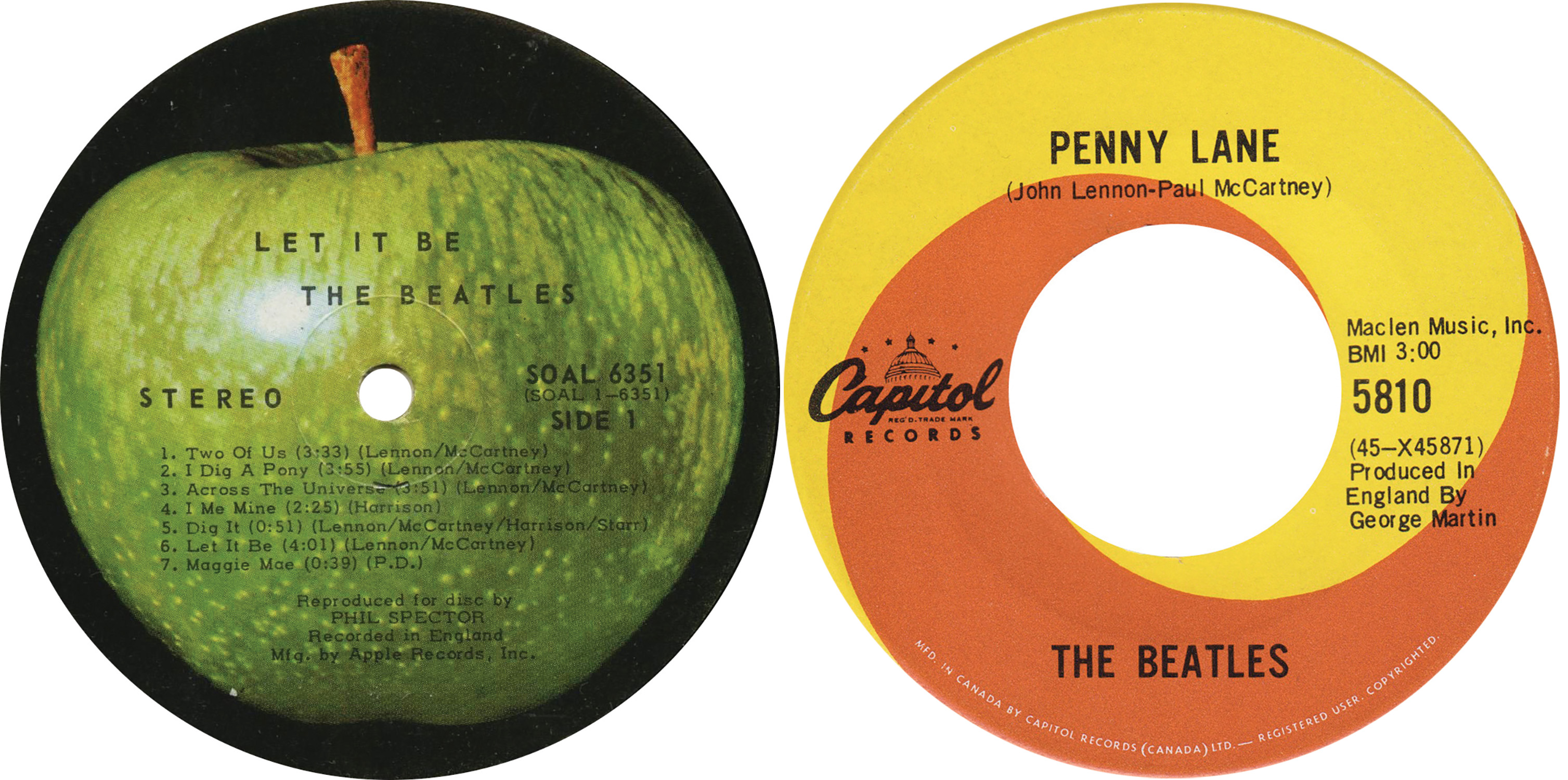 Columbia (or CBS) has pressed Beatles records as early as 1973, following a worker strike at Compo/MCA, and pressed records for Capitol until 1976. The strike was apparently never resolved and CBS was therefore used again as the main pressing plant for Capitol, between late 1983-1984 (when Capitol's Mississauga plant was decommissioned) and 1987 (possibly even in the early 1990s, when Capitol of Canada stopped producing Beatles vinyl records). Columbia pressed both LPs and singles. Columbia discs are recognized by a very thin 68 mm pressing ring (for LPs), and by their etched matrix numbers that follow typical Columbia numbering. Both subcontracting periods display similar characteristics, but 1970s records on the orange label (left image) are usually much thicker than their later retro rainbow counterparts (right image). Columbia also took over pressing Apple records between 1973 and 1975 (centre image).