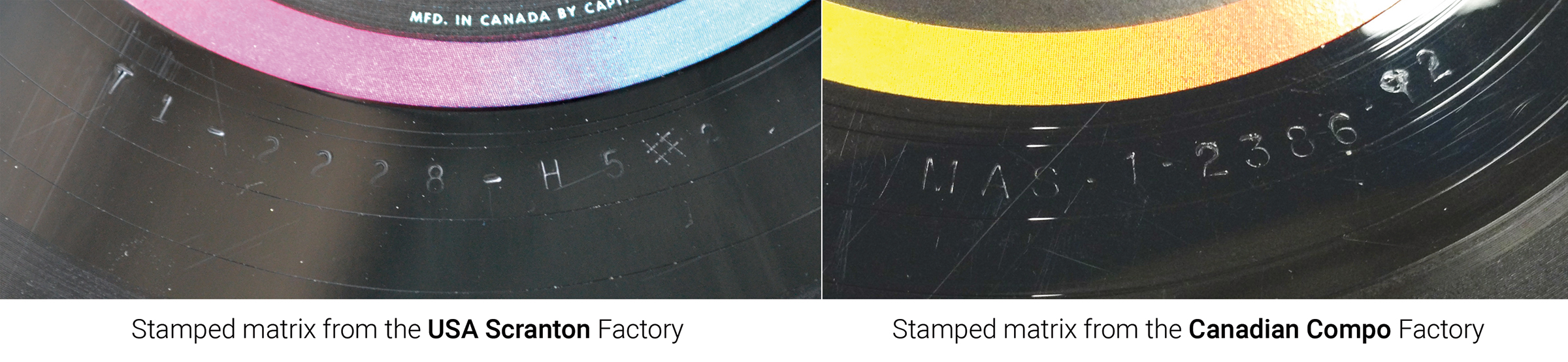 Finally, each pressing plant had its own equipment that left different "tool marks" on the pressed disc, namely by its gripper that left a pressing ring, like a signature that is unique to every plant. These markers are the main identifier of where a particular record was pressed (along with matrix information). Below is a list of the different pressing plants contracted by Capitol for Beatles records, with photo examples of their distinctive features to allow proper identification of Canadian pressed discs.