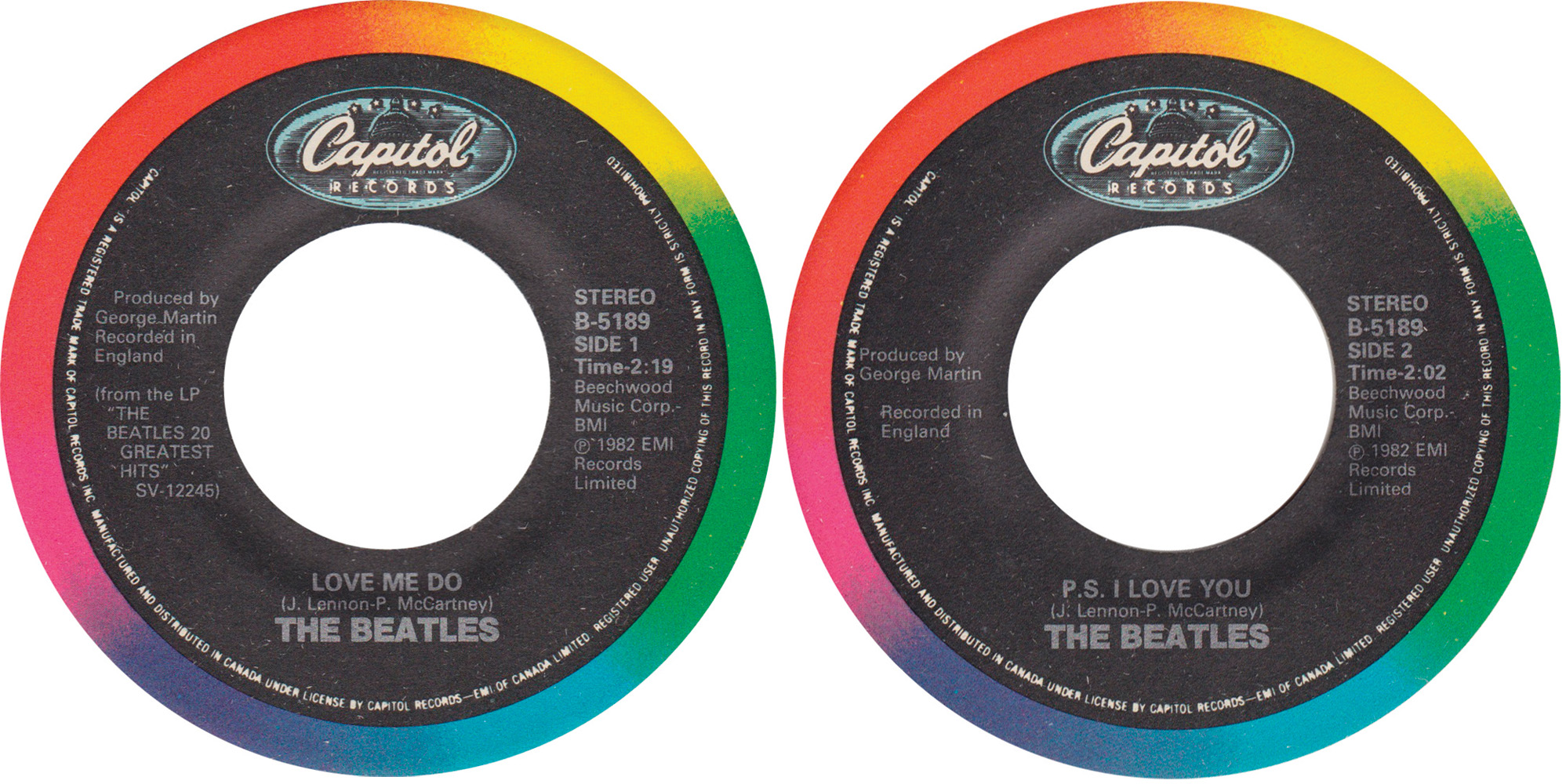 This variation (45.5189.13.1) is the last pressing of Love Me Do in Canada. This is more or less the "regular" issue of the 20th anniversary v version, with the new catalogue nubmer and misleading STEREO designation, but this time, on the more common retro rainbow label. This variation was pressed by Columbia around 1984.