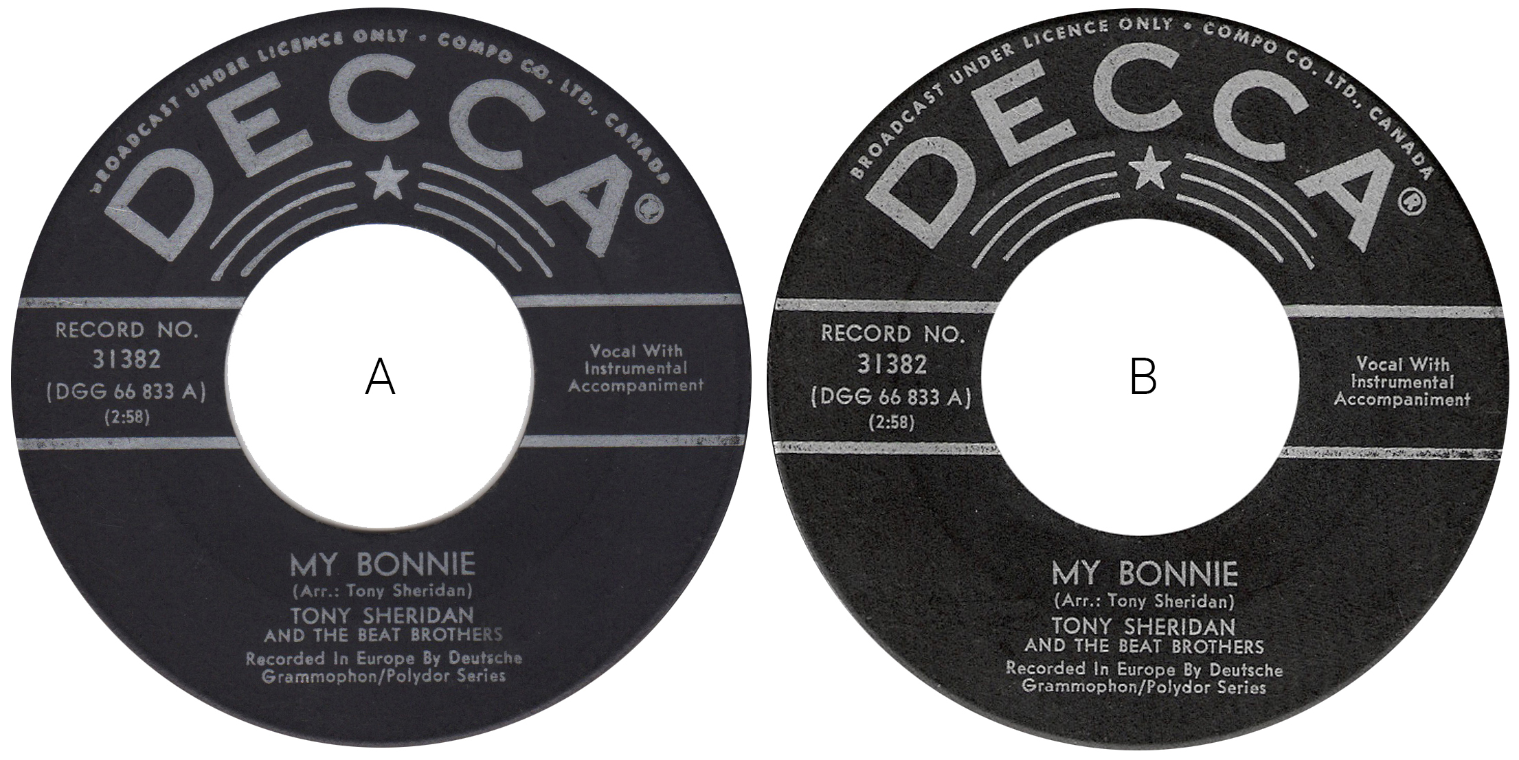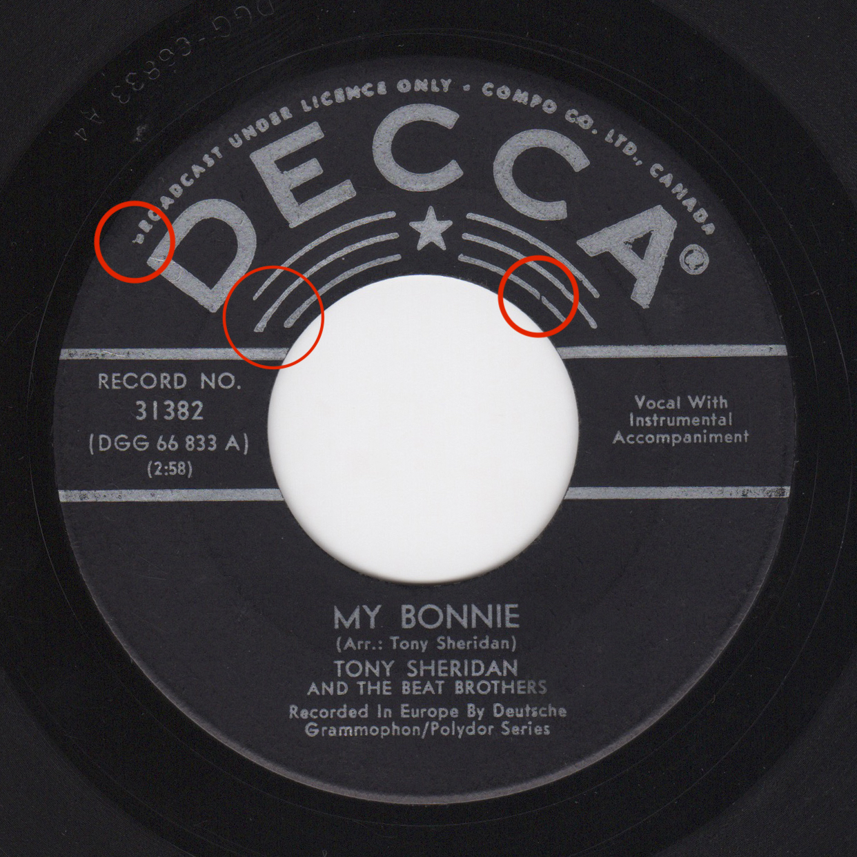 The label variations have been covered in detail in the previous sections, but one subtle detail is also deemed important enough to be covered in this archive. This pressing detail also helps identify an authentic Canadian copy of My Bonnie on the Decca label:
