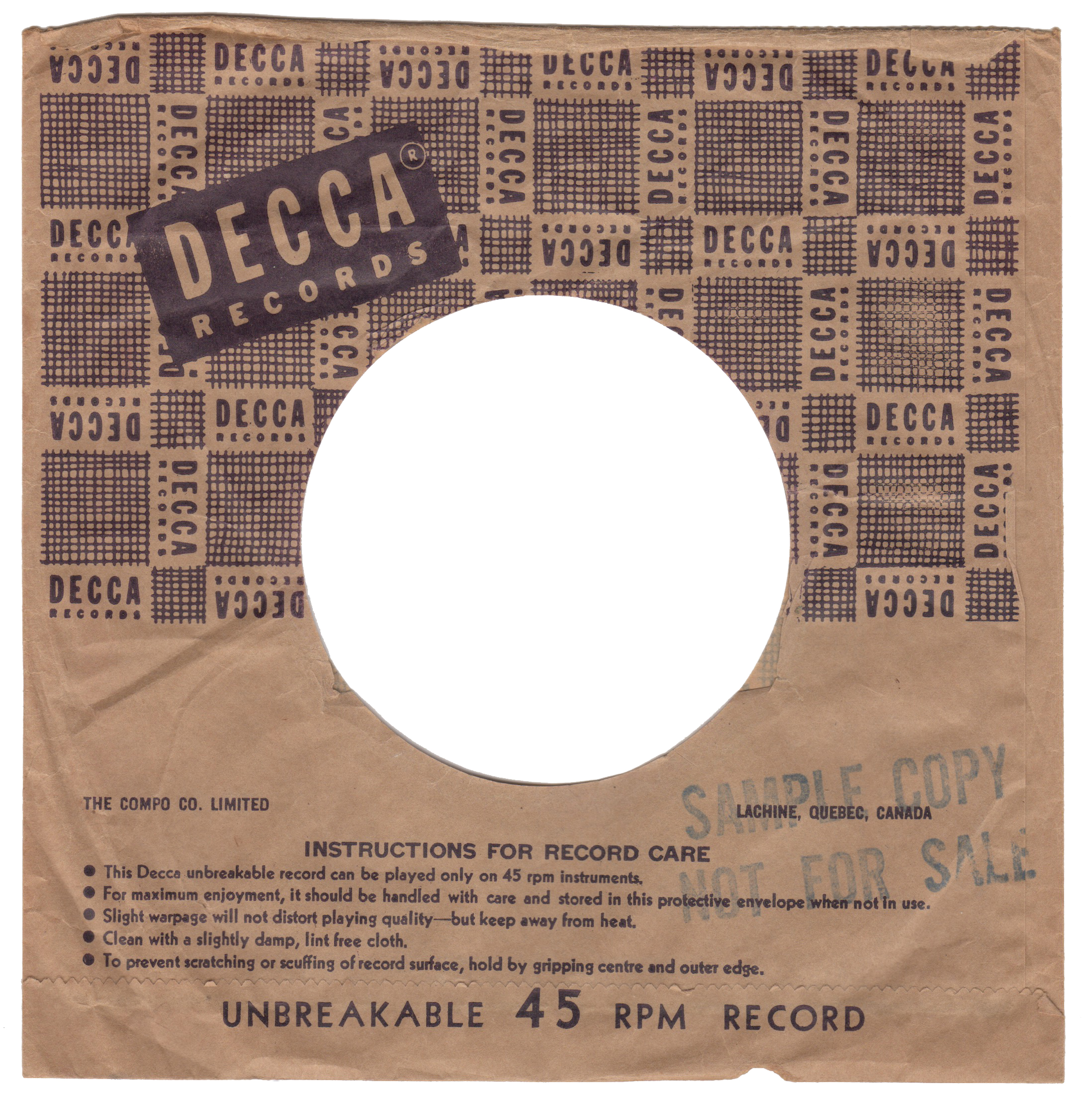 As related by Piers Hemmingsen, approximately 200 copies of Decca 31382 were pressed during the week of April 16, 1962, featuring black and silver paper labels. Once manufactured, each disc was placed in a brown paper stock Decca/Compo 45 RPM record sleeve, many of them stamped with the text "SAMPLE COPY NOT FOR SALE" in blue ink.