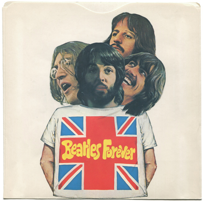 In 1976, Capitol Records of Canada launched a wide reissue campaign for nearly all of the Beatles’ singles, introducing them on the orange label (3rd generation). To mark the occasion, they created a special series called “Beatles Forever.” This series featured a distinctive sleeve design: a montage of the four Beatles' heads from Let It Be, printed over a white t-shirt adorned with the Union Jack. While the front cover was uniform across all releases, the back of each sleeve listed the title of the specific single, making each one unique in its own way.