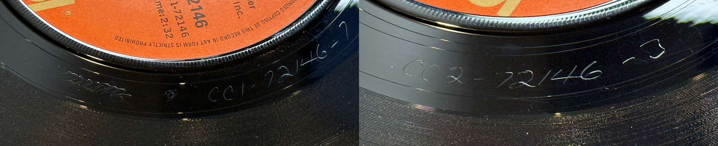 45.72146.8.1 (Capitol pressing) was also a STEREO release and these were pressed from yet again, another different lacquer cut than 45.72146.7.1. Although the label does not state a stereo release, and although the matrix numbers remain similar to previous mono pressings, the mix found on this pressing is nonetheless a true stereo mix.