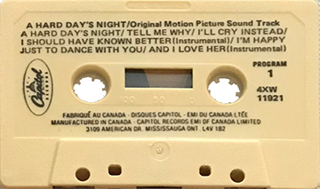 The cover (or J-card) was under the old black spine with three bars format. The layout and design were generic to all Capitol releases. Black spine tapes were originally introduced quite early and overlapped with blue spine issues. (It is not known what made a release blue or black spine). Early releases had paper labels (white and/or yellow) on a white plastic shell. White paper labels were used until the mid 1970s, when yellow paper labels were used instead, around 1978, but no copy of A Hard Day's Night was ever confirmed on these earlier incarnations. This variation dates from around 1982, but the cover remained unchanged until 1985.