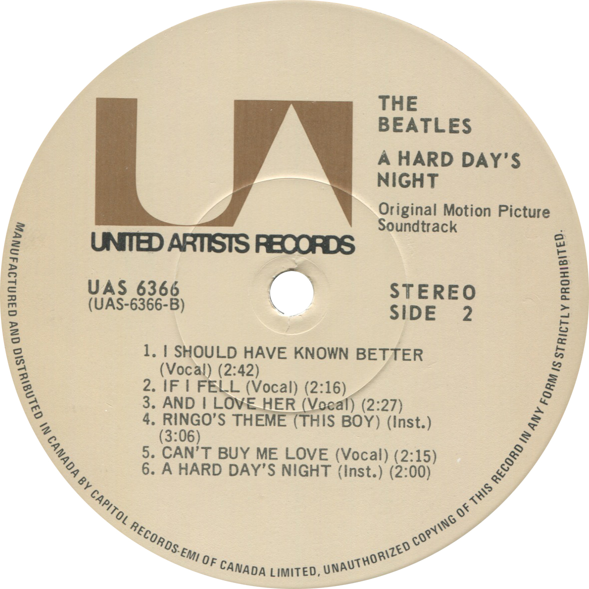 EMI had not yet acquired United Artists, but pressing operations were moved to Capitol's new Mississauga pressing plant (was it foreshadowing?). This was the last incarnation of the album on the tan label, after which it would be found on the sunrise label and other Capitol labels (see next entries).
