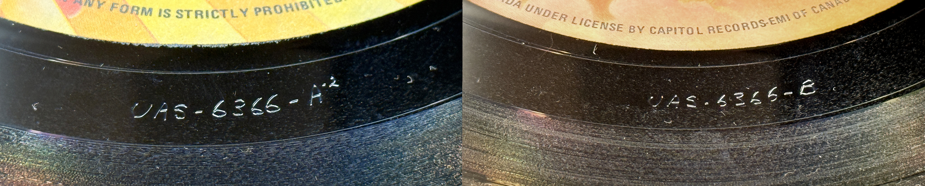 2) a more logical (non-alternating) timeline would mean that earlier 2nd generation purple labels were mistakenly used when the labels had already been updated to the "Under License" perimeter print. This would also mean that the first official Capitol reissue happened slightly later than the previously estimated 1978-1980 period (i.e., in the Fall of 1980, after the "Under License" perimeter text had been introduced in mid to late 1980).