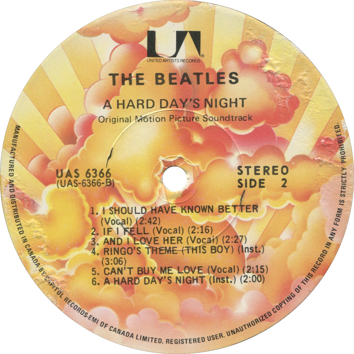 EMI had still not yet acquired United Artists, but pressing operations had been moved to Capitol's Mississauga pressing plant a while back. This new label design was the last to be offered on A Hard Day's Night before the album was officially transferred under Capitol Records in 1980.
