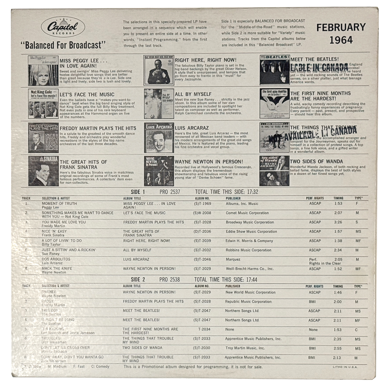 The "Great New Releases From The Sound Capitol Of The World" series was a promotional effort by Capitol that sent monthly selections of tracks to radio stations to promote their catalog. These were marked as "balanced for broadcast", meaning they were ready to be aired by DJs around the country. As Capitol's explanation went, these records were specially prepared in a sequence allowing DJs to play an entire side at a time, without any interruptions.