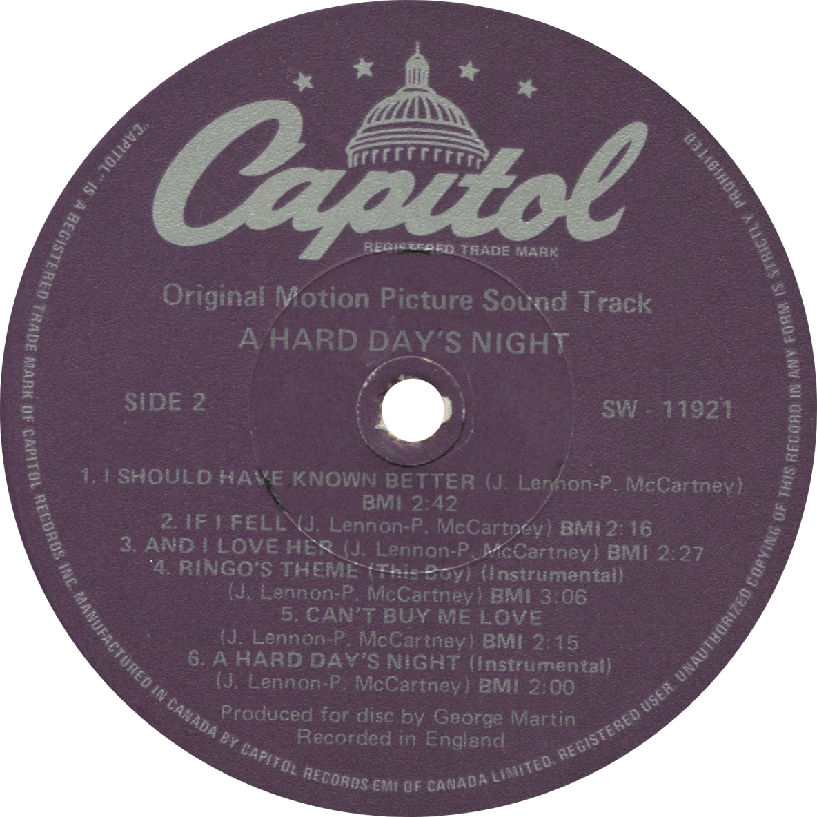 This variation marks the very first official released of the album on Capitol Records. Second generation purple label variations are usually amongst the most common variations. But the case is different for A Hard Day's Night, and it is actually one of the scarcest variations of the album. The 2nd generation purple labels are recognized by the perimeter print that states "Manufactured in Canada by Capitol Records-EMI". Later variations changed this text in 1980 for the "under license" text with a thinner font (see entry LP.6051.11.1).