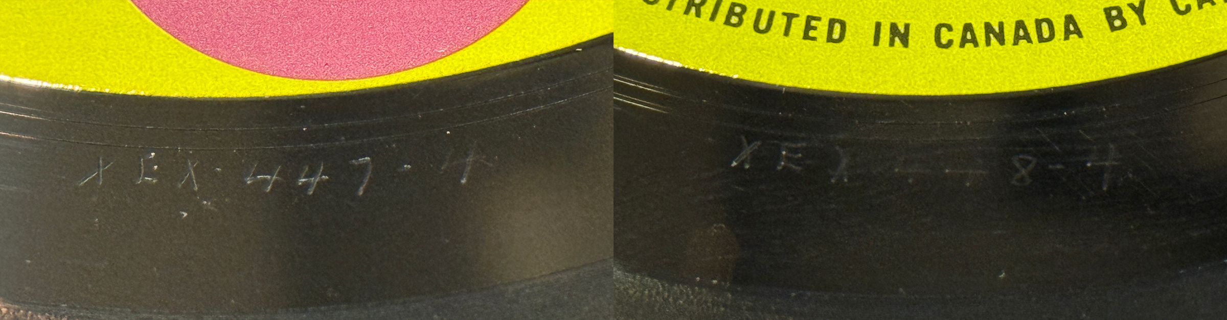 As was the case for all previous variations, Capitol of Canada subcontracted once again the RCA pressing plant in Smith Falls (Ontario) to manufacture new batches of albums with the new "Green Target" label. Matrix numbers sequencing is still inconsistent and these copies have a lower matrix number than some of its previous incarnations (up to "dash 6"), with a “dash 4” on both sides: