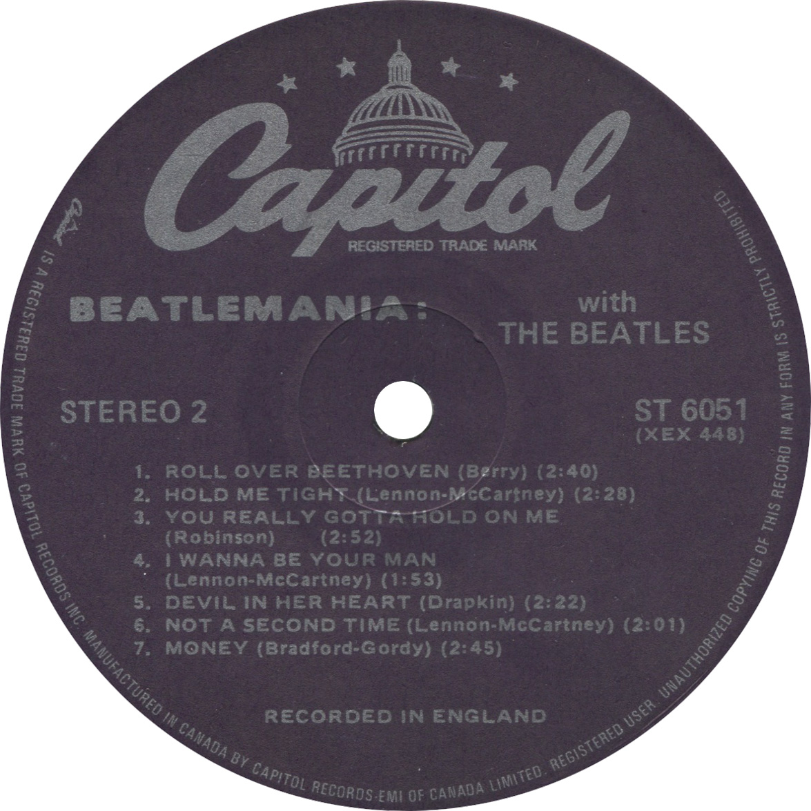 This pressings is an odd and scarce series of pressings. It features a darker purple label with the Capitol dome logo in the perimeter print. It seems that Capitol subcontracted Cinram to press these records while operations were still being adjusted in the new pressing plant.
