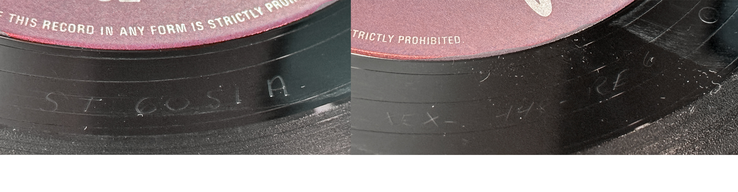 Making sense of the different stereo mixes is a challenge, but the real challenge lies more in the identification of when they appeared, and when they were replaced by a newer mix. Capitol and their pressing subcontractors never wasted any production material and used pressing plates until they were worn out. Plates for both sides of an LP did not necessarily wear out simultaneously, causing many copies pressed during a transition period between new masters to be hybrids between two mixes. It seems that a clear desire to produce a uniform series of reissues only happened with the retro rainbow label in 1984. Indeed, only then was a completely new master made from a proper true stereo mix finally introduced. This new master is quite apparent when comparing the width of the dead wax on each side.
