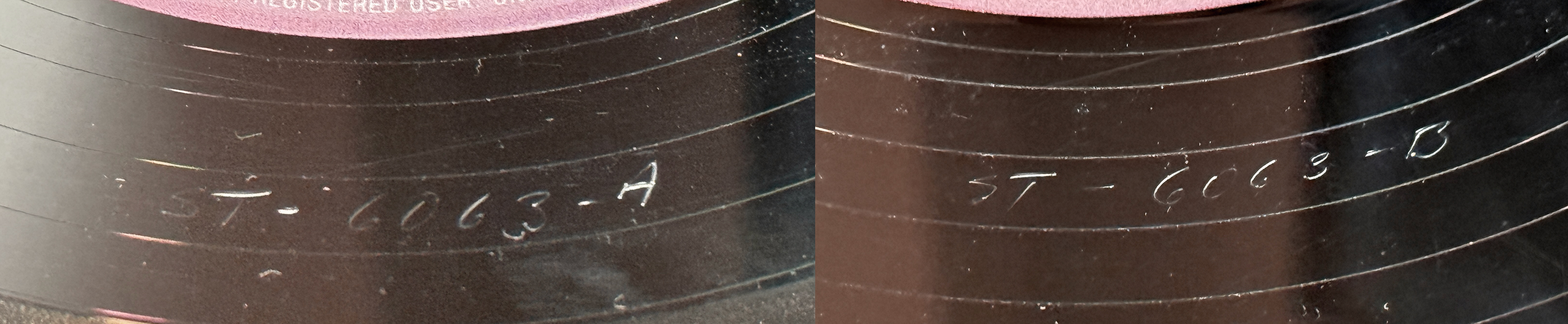 Making sense of the different stereo mixes is a challenge, but the real challenge lies more in the identification of when they appeared, and when they were replaced by a newer mix. Capitol and their pressing subcontractors never wasted any production material and used pressing plates until they were worn out. Plates for both sides of an LP did not necessarily wear out simultaneously, causing many copies pressed during a transition period between new masters to be hybrids between two mixes. It seems that a clear desire to produce a uniform series of reissues only happened with the retro rainbow label in 1984. Indeed, only then was a completely new master made from a proper true stereo mix finally introduced. This new master is quite apparent when comparing the width of the dead wax on each side.