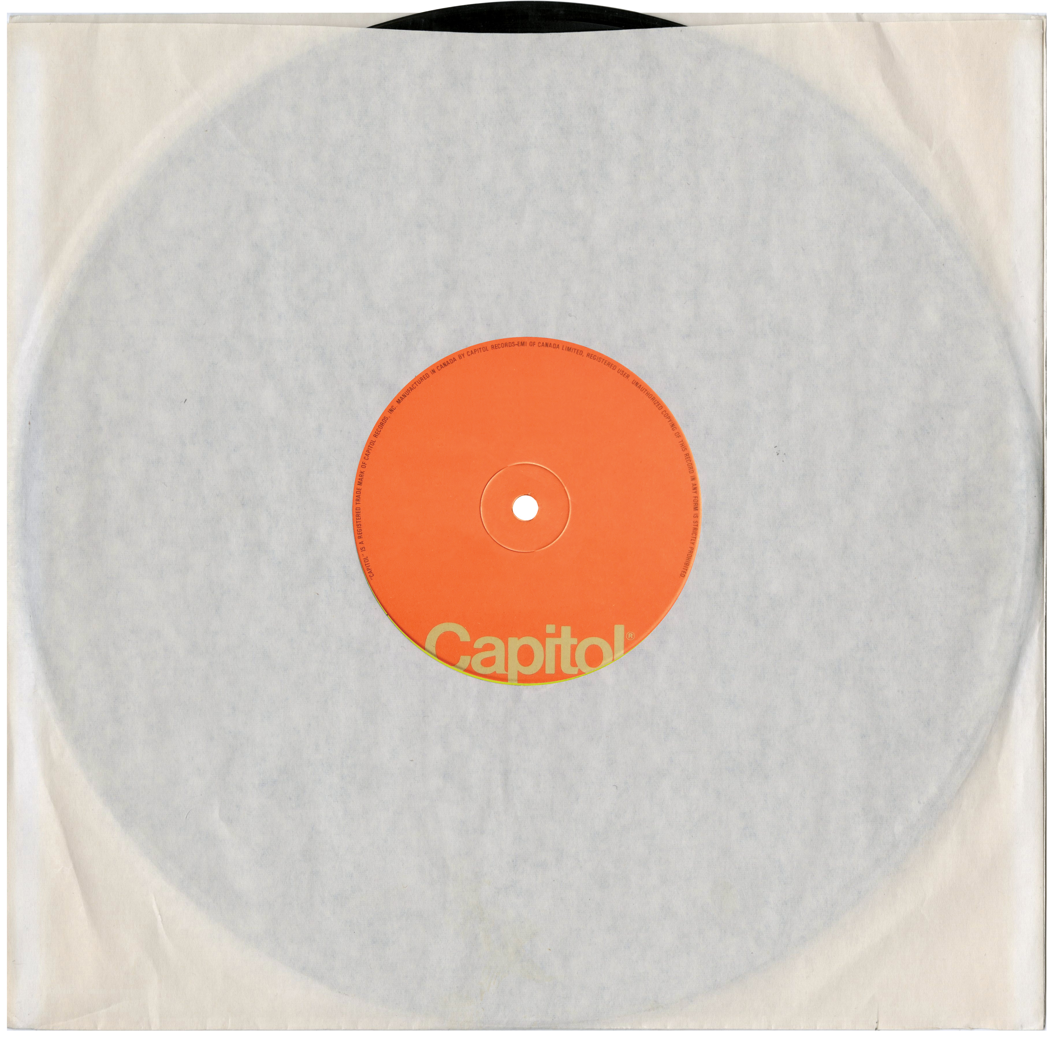 This edition was shipped in tight shrink wrap, with or without a plain paper LP inner sleeve. These Capitol sleeves are square and have a slight curve at the top.
