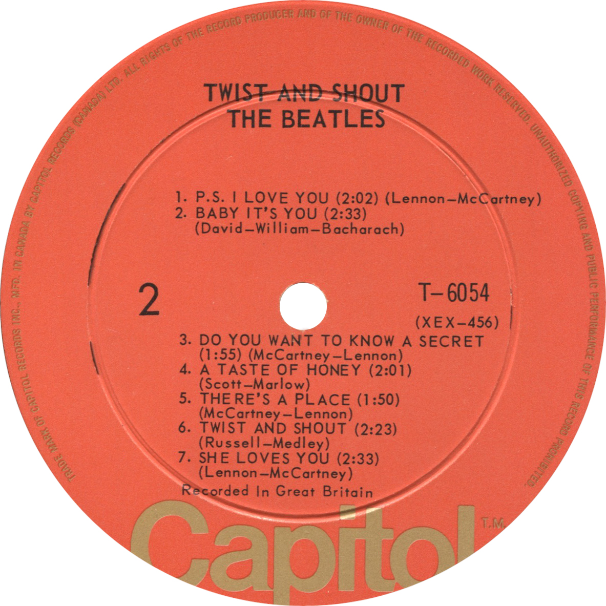 Capitol of Canada subcontracted the RCA pressing plant in Smith Falls (Ontario) to manufacture new batches of albums, this time with the new "Orange" label (1st generation with gold perimeter print). Known copies have either "-2" matrix numbers on both sides and were made by the same plates as LP.6054.5.1, or with a "no dash" on side 2, using earlier plates; it is possible that earlier plates were reused, or that newer plates were made from a previous mother.