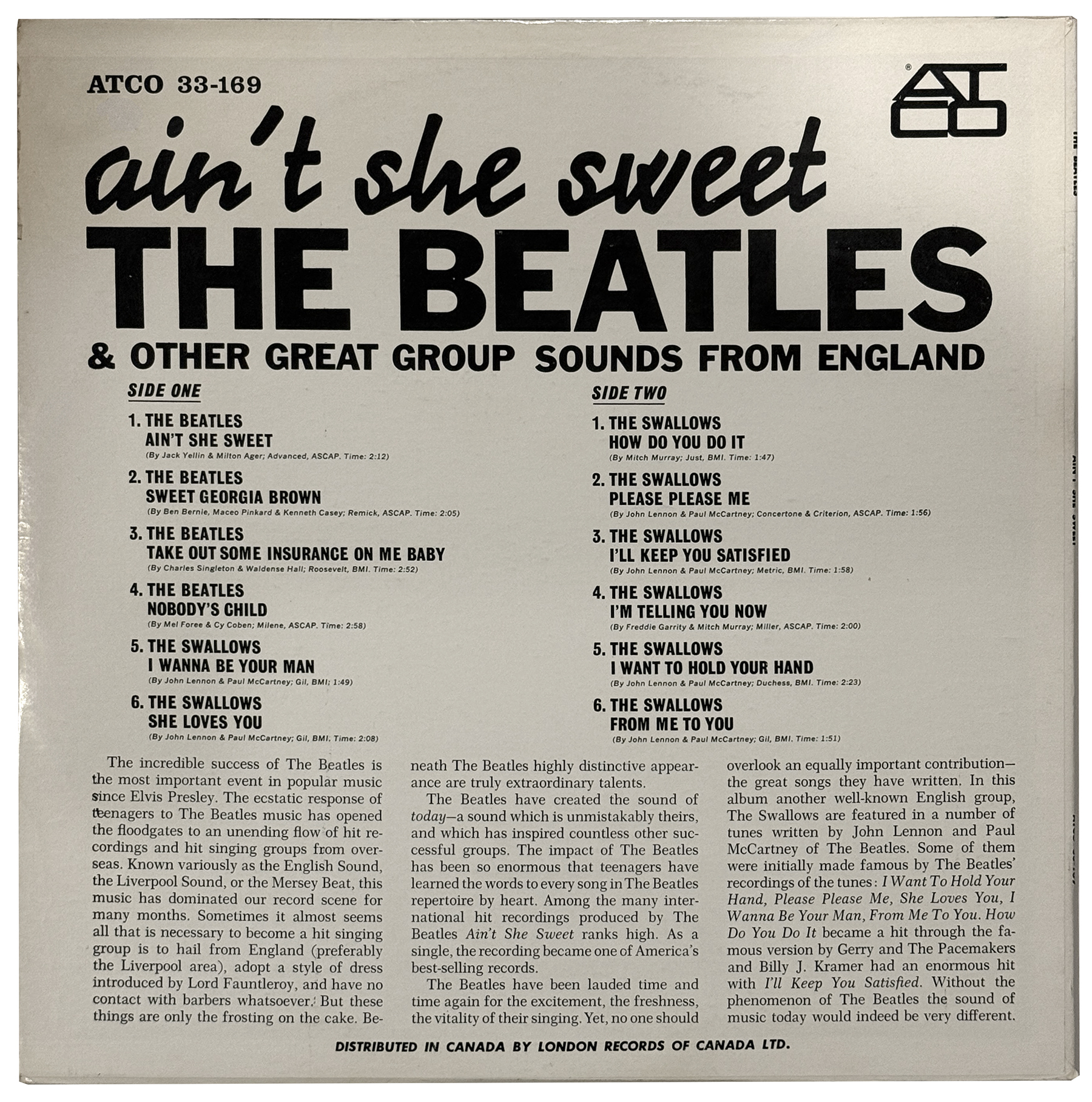 This album stands as a textbook example of a “cash-in” compilation. Since ATCO / London Records did not own the rights to any of Capitol’s Beatles recordings, the label capitalized on the band’s fame by promoting them prominently as the main act, while actually using only a few older Tony Sheridan–era tracks they were legally entitled to release under prior agreements (e.g., the Ain’t She Sweet single).