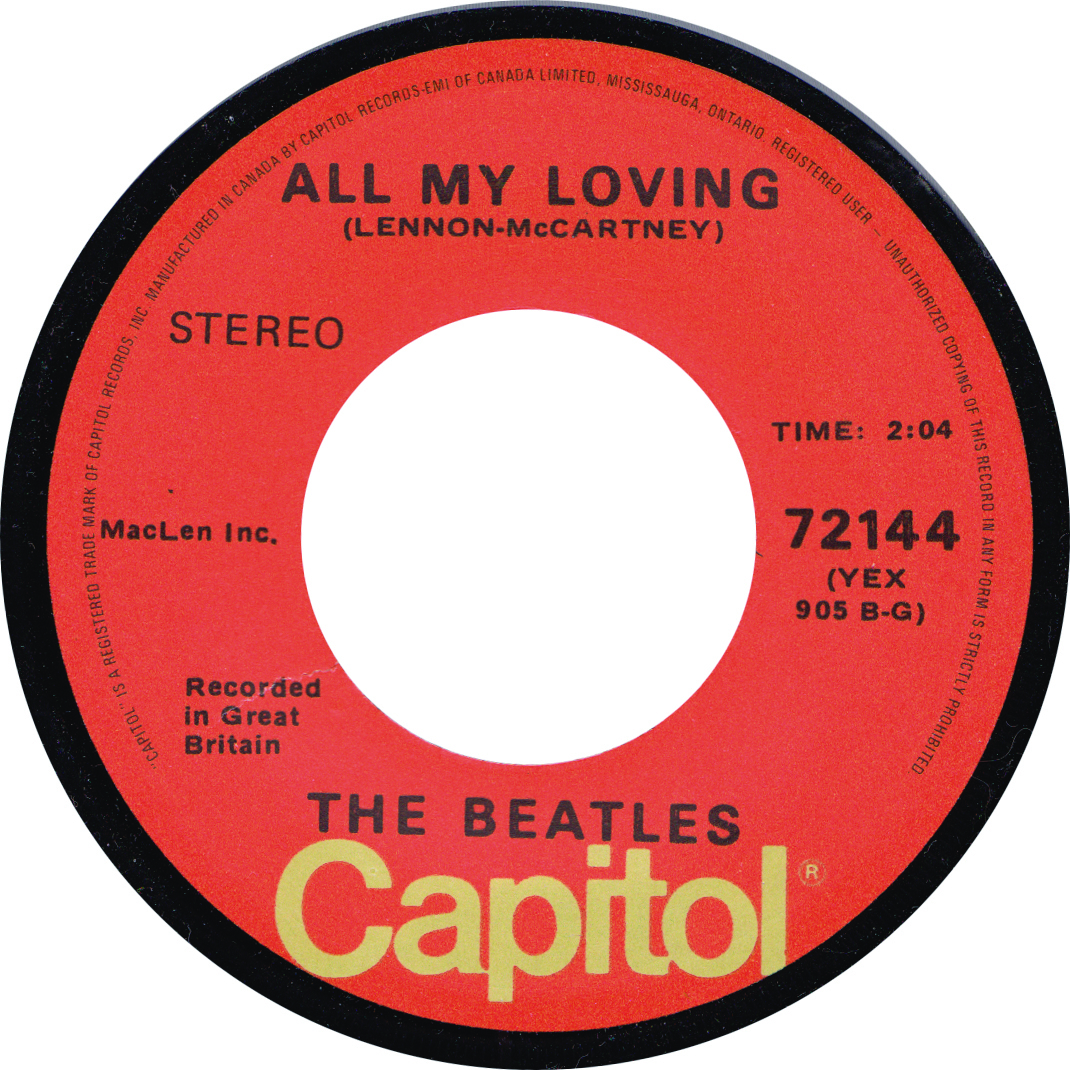 This variation is more common than its previous orange label incarnations and was pressed in larger quantities as part of the Beatles Forever Series (see separate entry in the singles variations page). This pressing was available between 1976 and 1978, when Capitol changed its design to the purple label. Note that All My Loving was never issued on the purple label, only to reappear in 1984 on the retro rainbow label (45.72144.12.1)