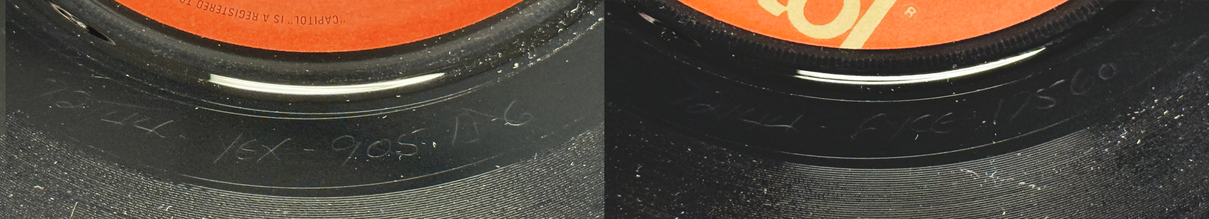 Variation 45.72144.8.1 features a completely different text layout, a bumpy ridge and was made from a new lacquer cut. This pressing marked the beginning of the new in-house Capitol pressing plant operations in Mississauga, Ontario.