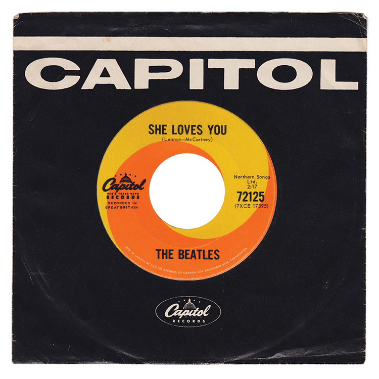 This single was the fourth effort by Paul White to push the Beatles on the Canadian market. But this time around, the Beatles' success in the UK was felt here in Canada as well, and She Loves You was the first commercial success of the band in Canada (the first title to chart in Canada, reaching #5 in December, and shortly after, the No. 1 spot. (source: P. Hemmingsen, The Beatles’ Canadian Discography part. 1)). This record marks the Beatles gaining popularity in Canada.