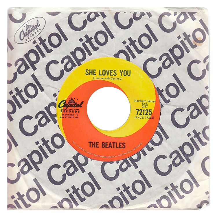 This third variation of She Loves You features the new swirl label with brackets - "CAPITOL RECORDS (CANADA)". These brackets copies are much harder to find as they were made in small quantities in 1967, and were the last repressings of She Loves You to be made in Canada.
